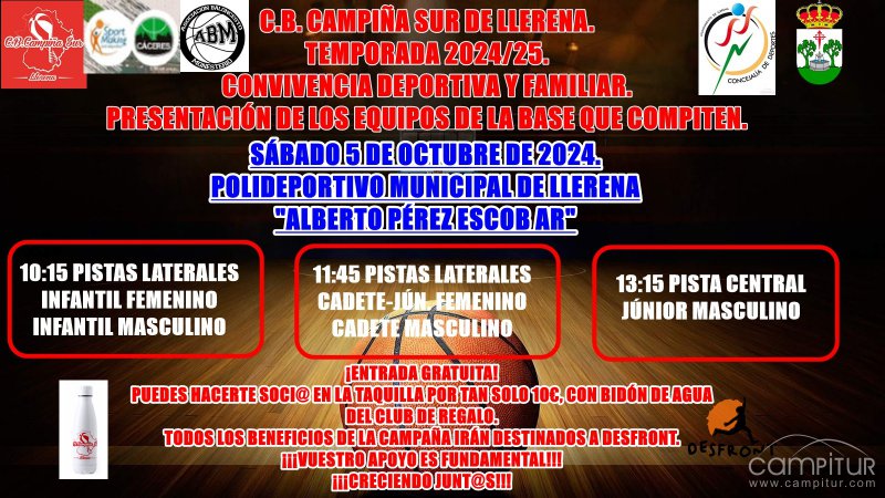 La mañana del sábado 5 de octubre de 2024, tendrá lugar la puesta de largo de los equipos de la cantera del C.B. CAMPIÑA SUR DE LLERENA, que competirán esta próxima temporada en JUDEX. Desde esta temporada, queremos dar un paso importante más. Queremos que sea no solo una CONVIVENCIA DEPORTIVA, que sea también una CONVIVENCIA FAMILIAR, en la que los jugadores, entrenadores y familias de nuestro club (también los y las que quieran participar de Monesterio y Cáceres), compartamos tiempo, espacio y diversión también fuera de las pistas.